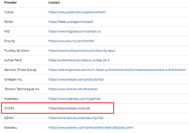 Tính đến tháng 12/2020, chỉ có 13 trong số hàng trăm loại khóa xác thực có thể vượt qua được các thông số cũng như các yêu cầu khắt khe đối với quy trình đăng nhập trong Microsoft Azure AD, trong đó có VinCSS FIDO2.