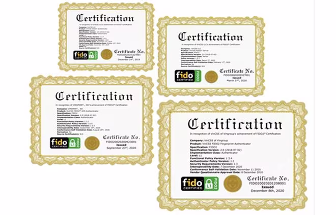Sản phẩm VinCSS FIDO2® Fingerprint là sản phẩm thứ 4 được cấp chứng chỉ FIDO2 quốc tế. Ba chứng chỉ FIDO2 trước đó là dành cho khoá VinCSS FIDO2® Touch 1, máy chủ xác thực VinCSS FIDO2® Server và khoá VinCSS FIDO2® VOS trên điện thoại Vsmart.