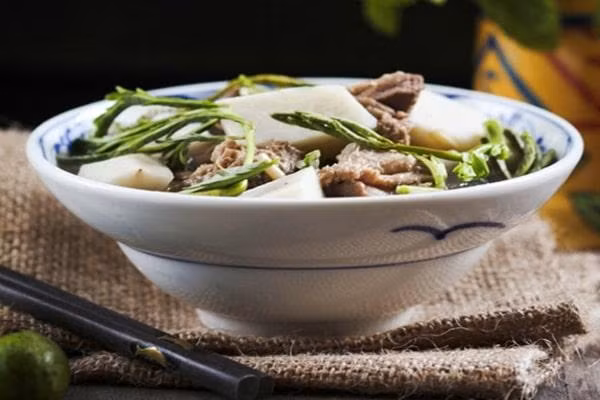Cũng liên quan tới rau rút, một món ăn dân dã nhưng lại đặc biệt cầu kỳ, thích hợp cho những ngày nóng nực là canh cua khoai sọ rau rút. Cua ở đây phải là cua đồng, làm sạch, giã nhỏ, gạch cua được khêu ra để riêng làm màu. Cua sau khi giã thì lọc, bỏ bã, đặt nồi nước lọc cua lên bếp, đun sôi.