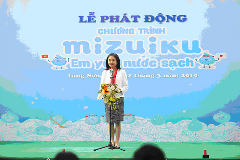 Bà Tomomi Fukumoto, Giám đốc điều hành, Bộ phận Phát triển Bền vững, Tập đoàn Suntory (Nhật Bản) phát biểu tại Lễ khởi động chương trình “Mizuiku – Em yêu nước sạch” năm 2019