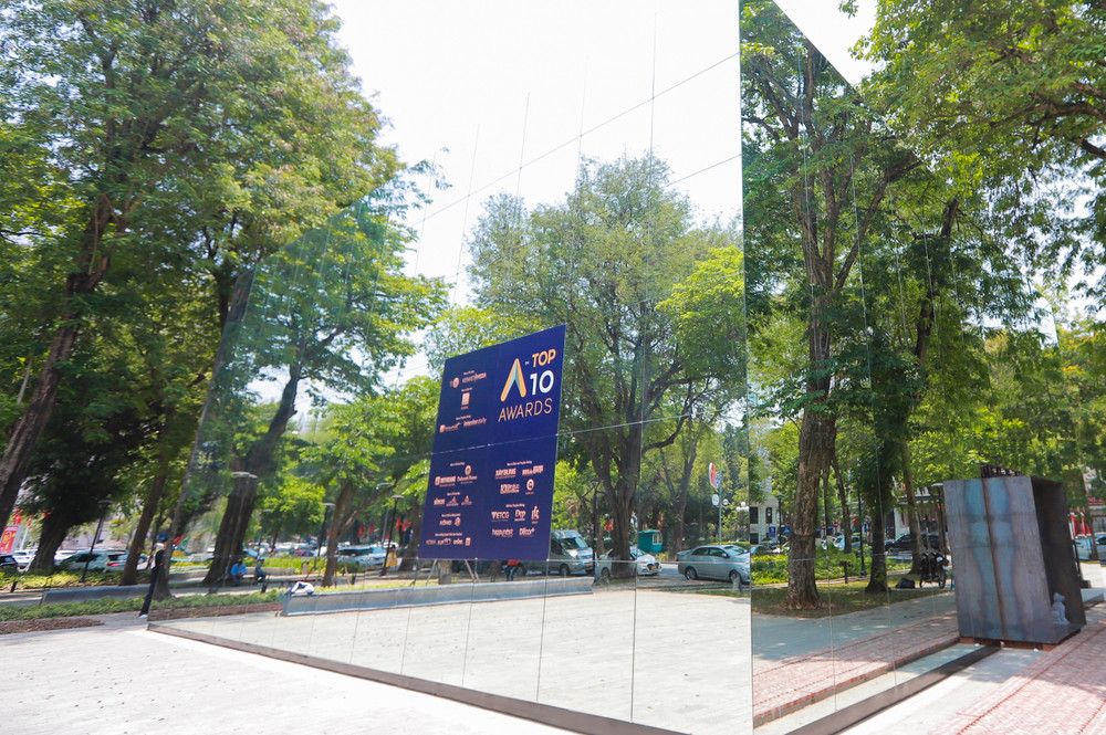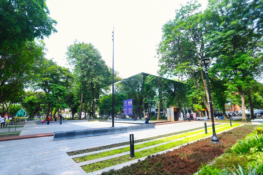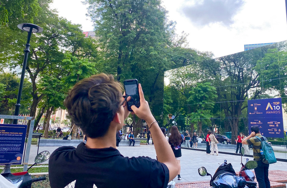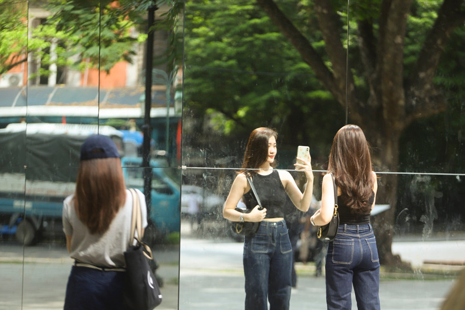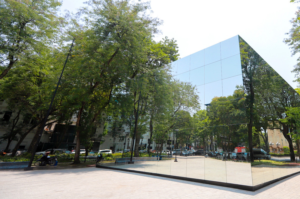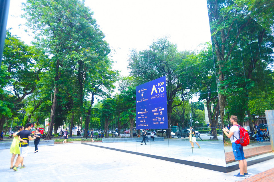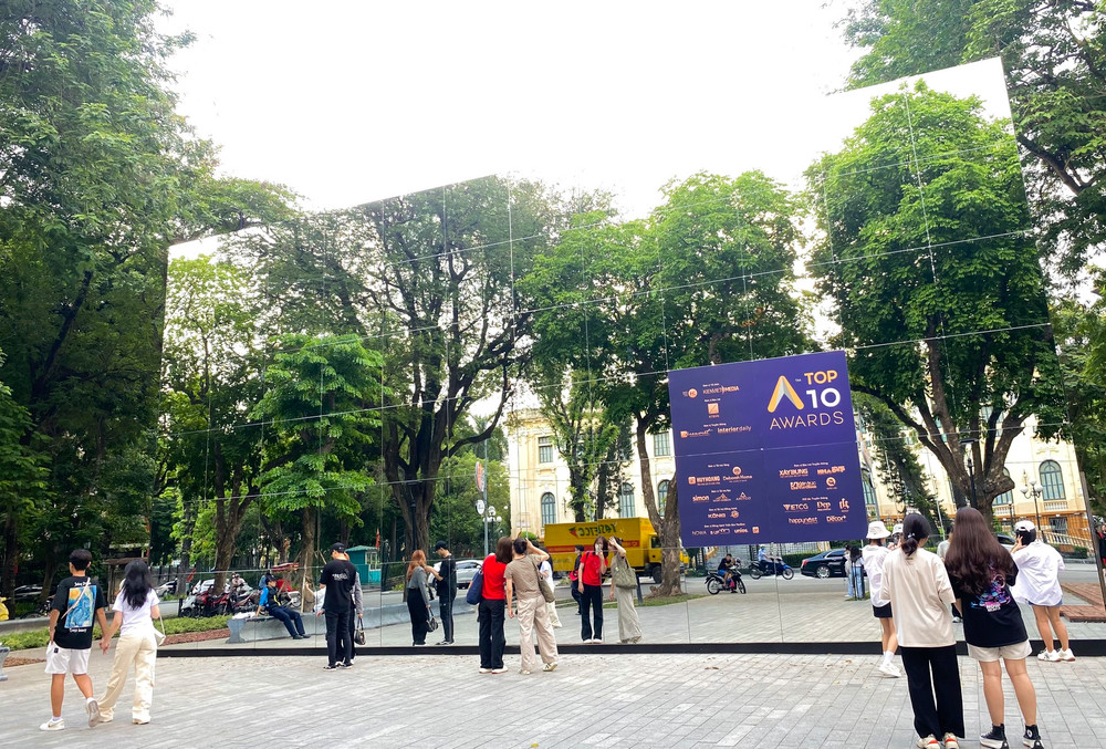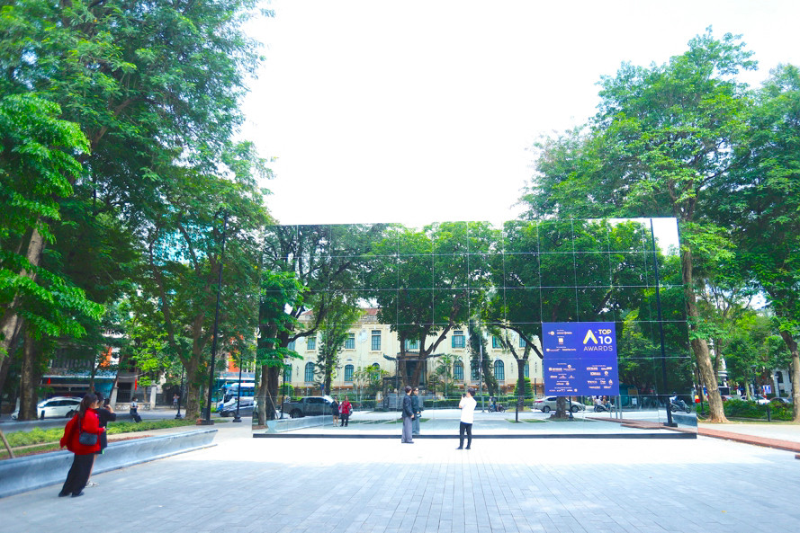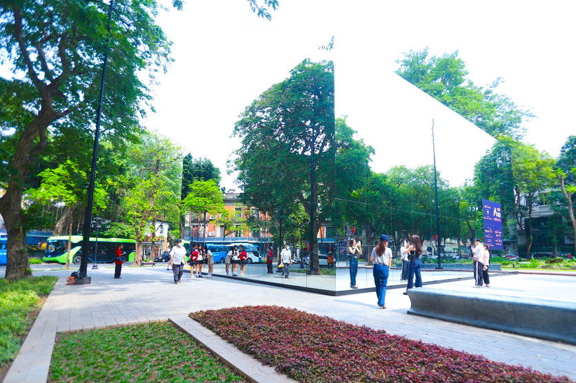 ANTD.VN - Khối gương kính 3D khổng lồ tại vườn hoa Diên Hồng (quận Hoàn Kiếm, Hà Nội) thu hút đông đảo người dân cũng như du khách trong dịp cuối tuần. Được biết, khối gương kính 3D này thuộc triển lãm "Top 10 Awards Pavilion" với 4 mặt kính khổng lồ được ghép từ nhiều tấm kính nhỏ, tạo thành một khối gương kính che kín đài phun nước vườn hoa con cóc và phản chiếu toàn bộ không gian xung quanh.