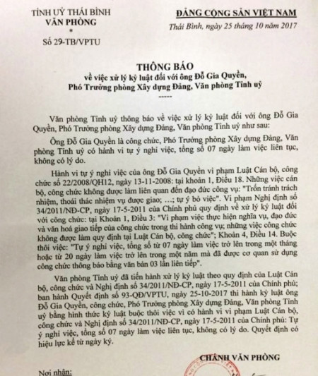 Ngày 26-12, CQĐT Công an tỉnh Thái Bình xác nhận đơn vị đã ra Quyết định khởi tố vụ án, khởi tố bị can đối với Đỗ Gia Quyền (SN 1976), nguyên Phó Trưởng phòng Xây dựng Đảng, Văn phòng Tỉnh ủy Thái Bình về tội "Lừa đảo chiếm đoạt tài sản", theo Điều 139 - BLHS.