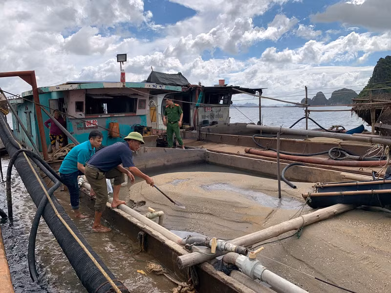 Trước đó, tại vùng biển thuộc phường Cẩm Thịnh, Phòng Cảnh sát môi trường kiểm tra 3 tàu vỏ xi măng, trong đó tàu mang số hiệu: QN-01 do Nguyễn Thị Hà (SN 1970) và Nguyễn Văn Tú (SN 1996), cùng trú tại xã Thanh Quan, huyện Thanh Miện, tỉnh Hải Dương, điều khiển; tàu QN-02 do Vũ Thị Mùi (SN 1974), Vũ Văn Tín (SN 1974) cùng trú tại xã Hùng Thắng, huyện Tiên Lãng, TP Hải Phòng, điều khiển; tàu QN-07 do Trần Mạnh Hùng (SN 1982) và vợ Phạm Thị Nhung (SN 1982) cùng trú tại thị trấn Nham Biền, huyện Yên Dũng, tỉnh Bắc Giang, điều khiển, đang có hành vi sử dụng hệ thống máy bơm có gắn ống cao su, chõ sắt để hút cát từ dưới biển lên khoang tàu.