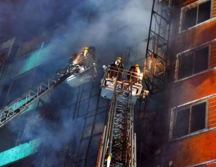 Lực lượng cứu hộ, cứu nạn dùng thang chuyên dụng để cứu người gặp nạn mắc kẹt trên tầng cao của quán karaoke phát cháy, đưa ra vùng an toàn