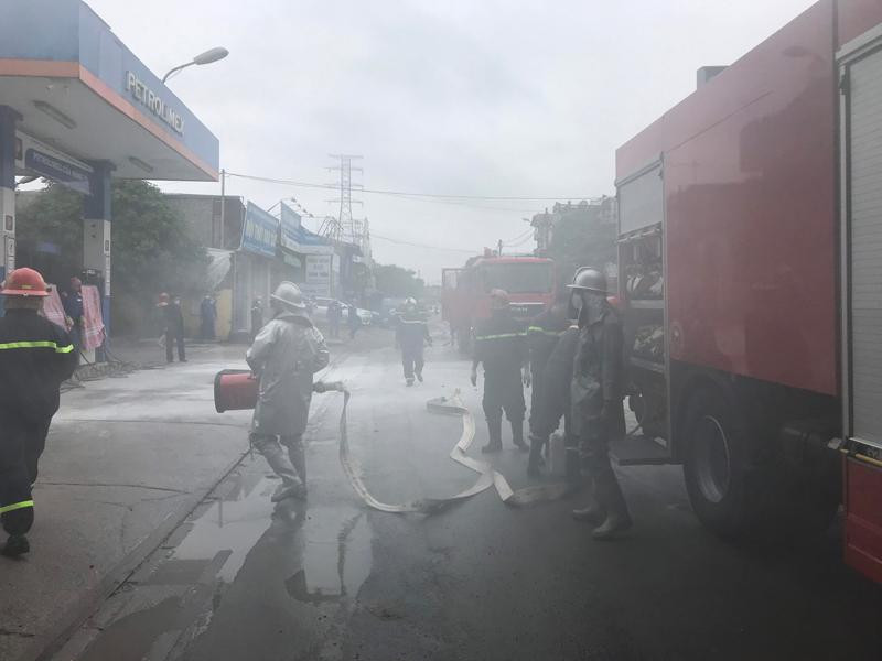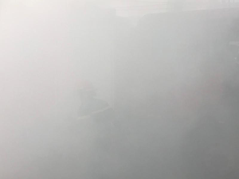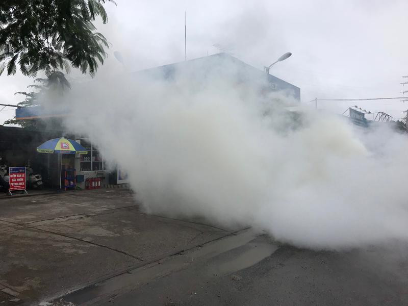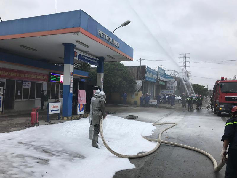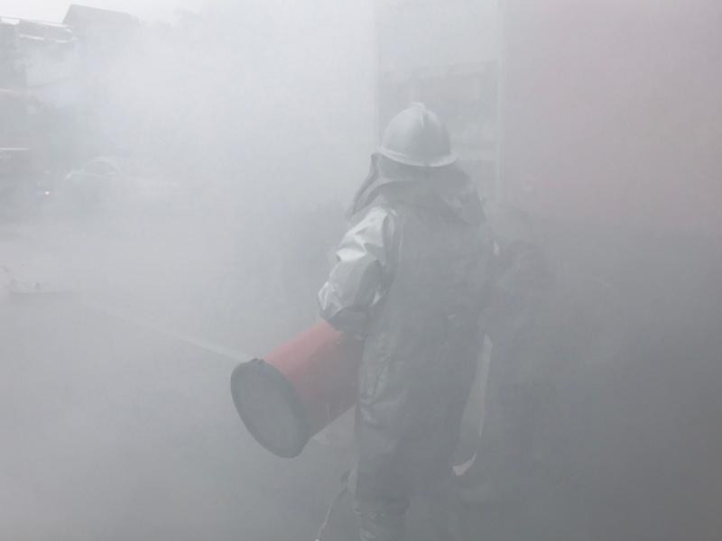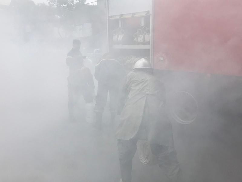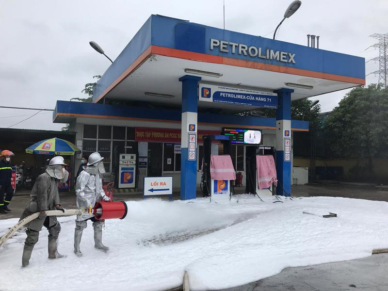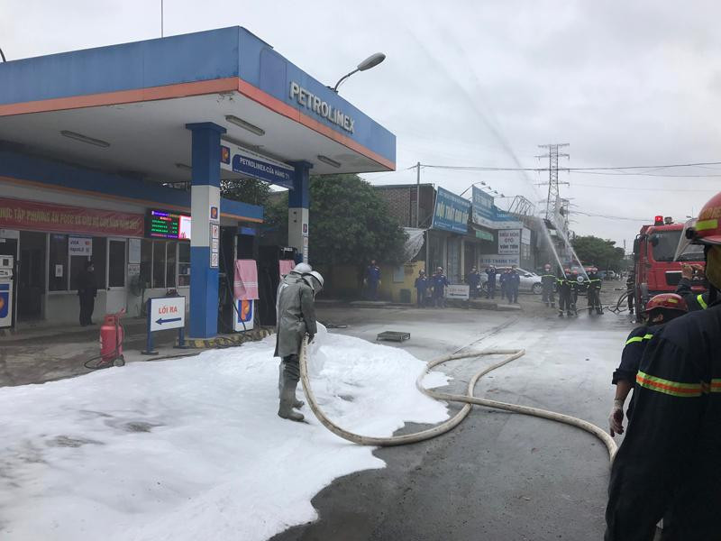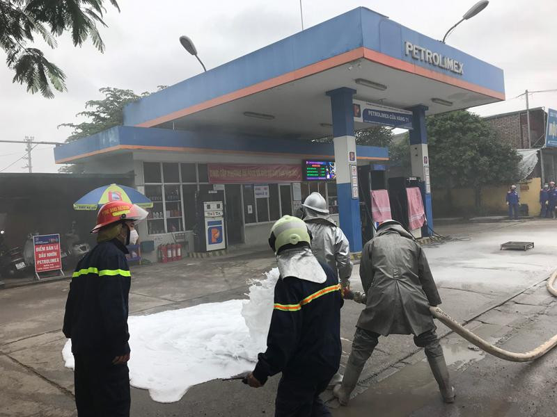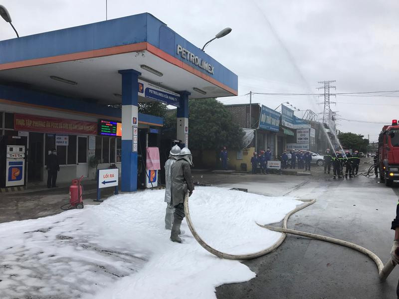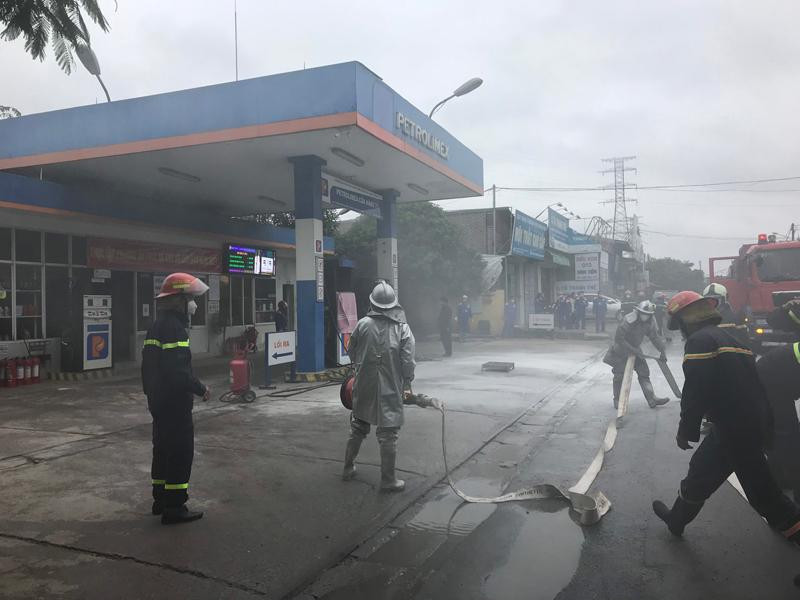 Khói trắng bao trùm lực lượng cứu hỏa trong đám cháy giả định ở cây xăng