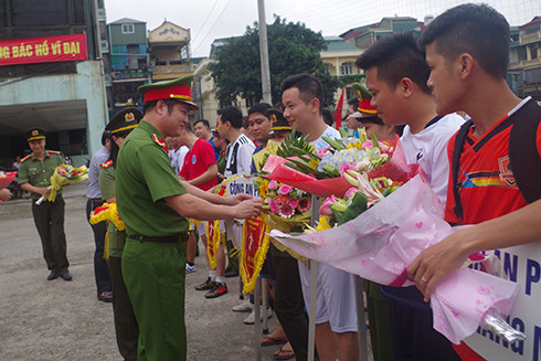 Đại tá Hà Mạnh Hùng - Trưởng CAQ Hoàn Kiếm tặng hoa và cờ lưu niệm cho các đội tham gia thi đấu tại mùa giải năm nay