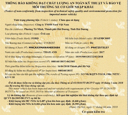 Tiếp đến, ngày 17-4-2018, VAQ cũng ra Thông báo không đạt chất lượng an toàn kỹ thuật và bảo vệ môi trường xe cơ giới nhập khẩu đối với mẫu xe Everest nhập khẩu.