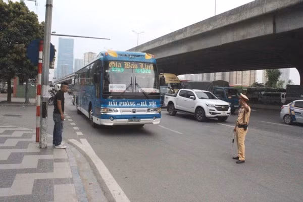 Lực lượng CSGT tăng cường kiểm tra xe khách đi qua khu vực đầu Đại lộ Thăng Long để kịp thời phát hiện, xử lý vi phạm