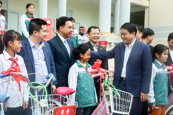 Chủ tịch UBND TP Nguyễn Đức Chung trò chuyện với các em học sinh vượt khó xã Đông Xuân, huyện Quốc Oai