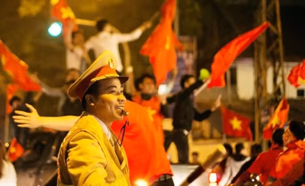 Những dòng người hâm mộ đổ ra đường mỗi lúc một đông, kèm theo đó là đủ loại âm thanh reo hò, đường phố ngợp màu sắc cờ đỏ sao vàng và những tiếng hô vang Việt Nam chiến thắng.