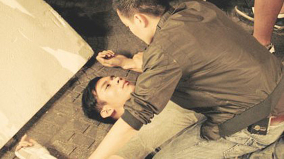 Trong phim có cảnh nhân vật mà Khoa đóng bị ngã từ trên nóc nhà xuống đất. Dù đã biết có cảnh quay này nhưng khi tới trường quay, Khoa không nghĩ là lại phải ngã từ trên độ cao “khủng” như thế. Dù vậy anh vẫn can đảm nhận tự diễn mà không cần nhờ tới “cascadeur”. Cũng kỹ đến từng centimet như cảnh hôn, đạo diễn Vũ Ngọc Đãng yêu cầu anh khi ngã phải ngã... đúng tư thế, hai tay phải quơ lên hoảng loạn, còn khi ngã xuống dưới đất thì phải nằm sấp mặt xuống và người co quắp lại. Trong khi đó dù đã rất cố gắng để chỉ ngã một lần là xong nhưng Khoa vẫn phải ngã lại tới mấy lần vì lúc thì quên động tác quơ tay khi ngã, lúc lại quên phải nằm sấp mặt xuống đúng như yêu cầu của đạo diễn. Cảnh quay này báo hại anh sau đó bị đau ê ẩm và mỗi lần nghĩ tới vẫn chưa hết sợ.