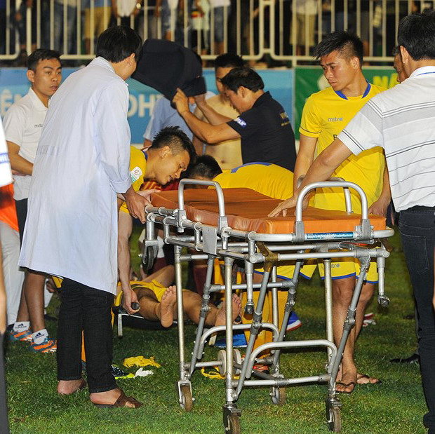 Xe cứu thương về sớm khiến trung vệ Văn Khánh phải chịu đau thêm 10 phút mới được đưa vào viện