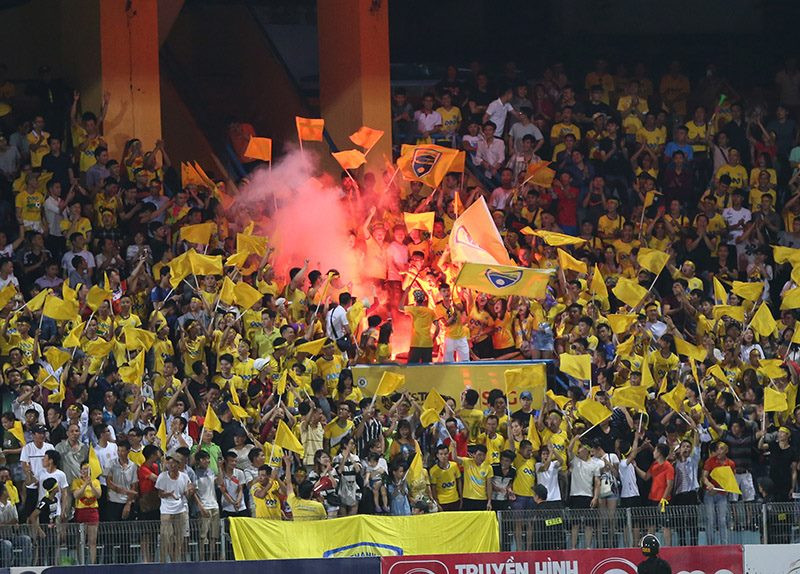 Cổ động viên Thanh Hóa đốt pháo sáng trên sân Hàng Đẫy ở vòng 9