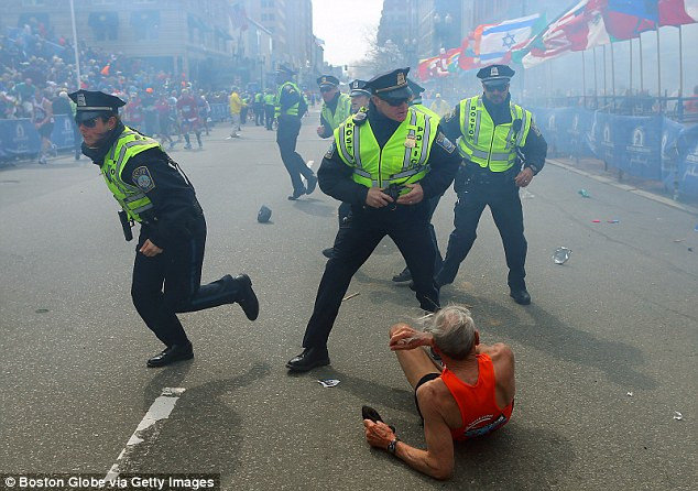 Cảnh sát bảo vệ một vận động viên ngã ngồi trên mặt đường, khi khói bom còn chưa tan