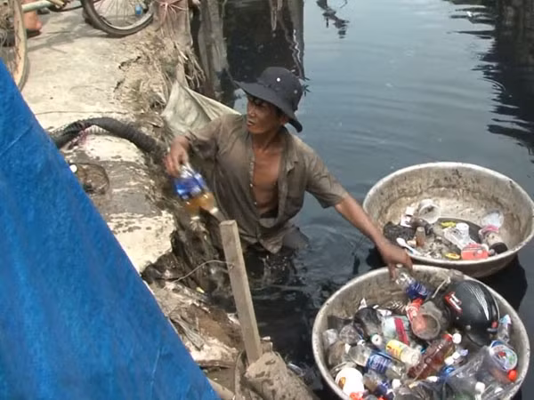Trong lúc trò chuyện, ông Hoàng vẫn không ngớt làm việc, tiếp tục mò mẫm, thỉnh thoảng đưa tay bóp thử một mảnh nhựa, thanh sắt, tìm được thì cho vào chiếc thau nhôm được ông buộc vào bụng. Cứ như thế, ông Hoàng “ve chai” đi dọc bờ bên phải, rồi lộn ngược sang bờ bên trái kênh, đôi chân ông chìm trong chất bùn đến gần đầu gối, đôi mắt chăm chú nhìn vào lớp bùn bẩn trên mặt kênh. Dưới chân, đầy vật bén nhọn với những nguy hiểm và mùi hôi thối khó chịu, nhưng ông vẫn bình thản làm việc.