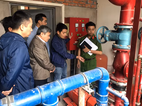 Đoàn kiểm tra hệ thống bơm chữa cháy tại tòa nhà