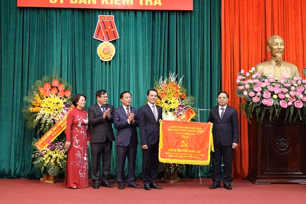 Phó Chủ nhiệm UBKT Trung ương Tô Quang Thu trao Cờ thi đua xuất sắc của UBKT Trung ương cho UBKT Thành ủy Hà Nội