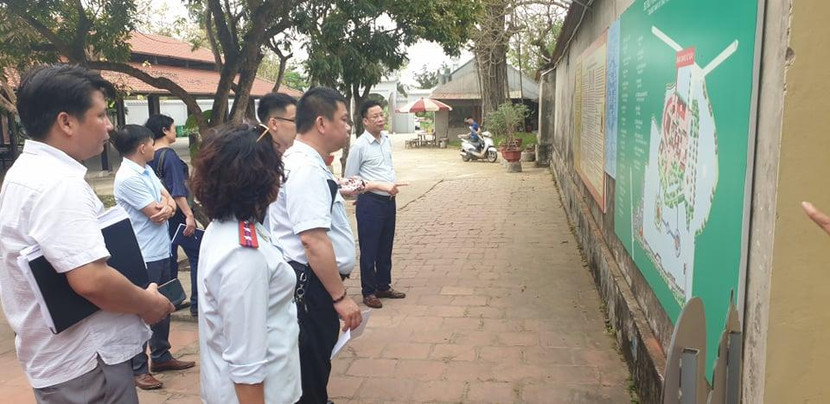 | Phó Cục trưởng Trần Đình Thành (ngồi) kiểm tra sơ đồ, hồ sơ xếp hạng di tích chùa Đậu |