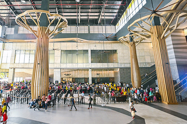 Sảnh trung tâm nhà ga bố trí 5 cây cột lớn cách điệu như 5 cây cổ thụ được che chở bởi Núi Mẹ, khiến du khách có cảm giác như đang bước vào một khu rừng. Ở một góc nhìn khác, 5 cây cột lại gợi nhắc hình tượng 5 bó lúa khổng lồ với màu vàng của những bông lúa trĩu hạt, tượng trưng cho một Tây Ninh trong mùa màng bội thu. Buổi tối, không gian của nhà ga càng trở nên lung linh hơn nhờ hệ thống đèn led bố trí dày đặc trong các “tán lá” và đèn chiếu ở phần “gốc cây”.