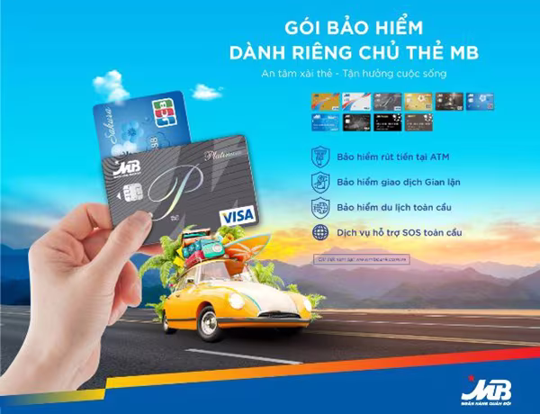 Chủ thẻ MB sẽ được hưởng các loại bảo hiểm như: Bảo hiểm rút tiền tại ATM (áp dụng thẻ tín dụng MB Visa, MB JCB, thẻ ghi nợ MB Visa Platinum, MB Vip hoặc MB Private) lên đến 200 triệu đồng/năm; Bảo hiểm giao dịch gian lận (áp dụng thẻ tín dụng MB Visa, MB JCB, thẻ ghi nợ nội địa và thẻ ghi nợ quốc tế MB Visa) lên đến 500 triệu đồng/năm và Bảo hiểm du lịch toàn cầu bao gồm: bảo hiểm tư trang chuyến đi, chuyến đi bị trì hoãn, bảo hiểm mua sắm… (áp dụng cho thẻ tín dụng MB Visa, MB JCB và thẻ ghi nợ MB Visa hạng Platinum trở lên) lên đến 21 tỷ đồng.