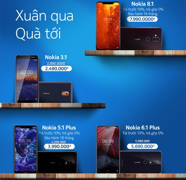 Cụ thể, trong khoảng thời gian từ ngày 19-2-2019 đến ngày 31-3-2019, Nokia 3.1, Nokia 5.1 Plus và Nokia 6.1 Plus sẽ được giảm giá xuống lần lượt chỉ còn 2,49 triệu đồng; 3,99 triệu đồng và 5,69 triệu đồng/chiếc.