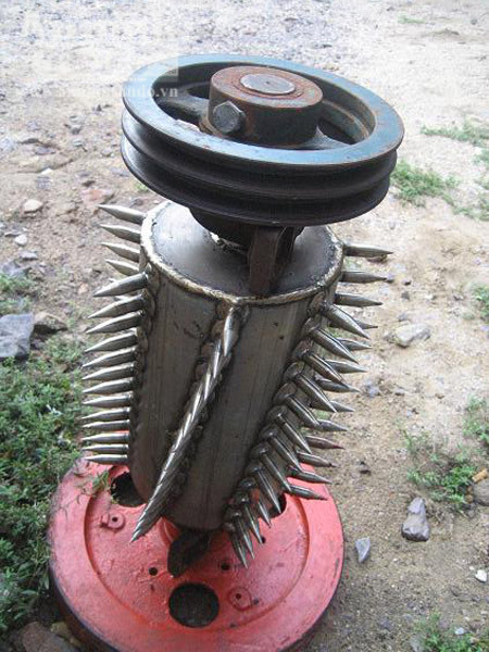 Trục quay máy xay đá lạnh với những hàng đinh sắt dài, nhọn đã nghiền nát chân