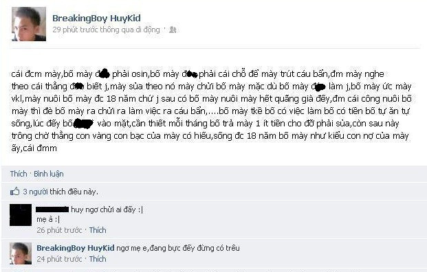 Những lời lẽ tục tĩu không chỉ được dùng để nói với người lạ, mà thậm chí ngay cả những người sinh thành ra họ. “... Bố mày ức mày vkl, mày nuôi bố mày được 18 năm chứ gì, sau có bố mày nuôi mày hết quãng già đấy…”.Thật không dám tin đây là những dòng viết về mẹ của nickname BreakingBoy HuyKid.
