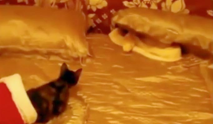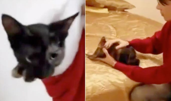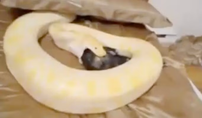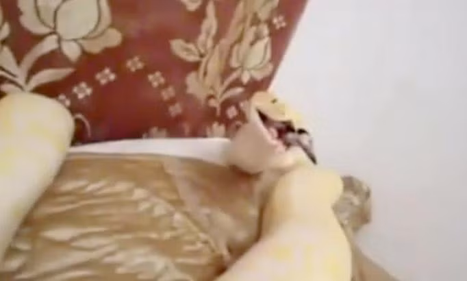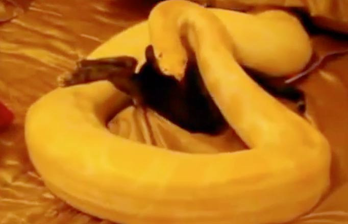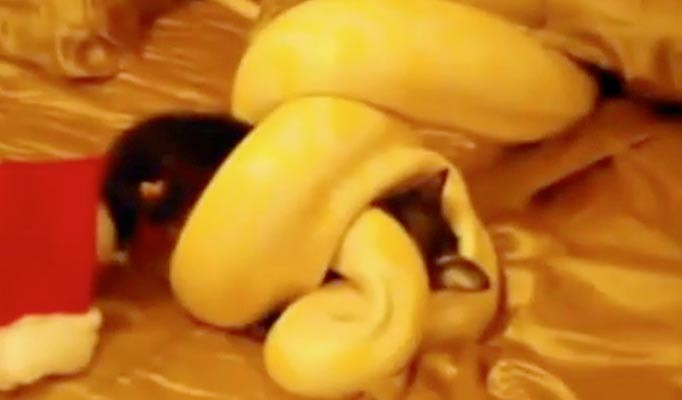 Đoạn clip mới đây được một người đàn ông ở độ tuổi khoảng 20 đã lấy một chú mèo mang tên Jasmine để “hiến” cho con rắn mà anh ta đang nuôi. Chú mèo đáng thương được đặt trong một chiếc mũ ông già Noel và đưa lên giường, nơi con rắn đang ẩn náu dưới một chiếc gối. Đó là một loài trăn Miến Điện màu vàng, dài khoảng 6m và là một trong những loài rắn lớn nhất thế giới.