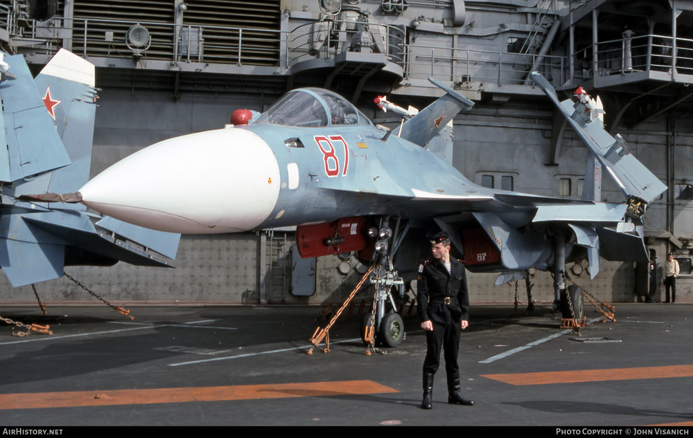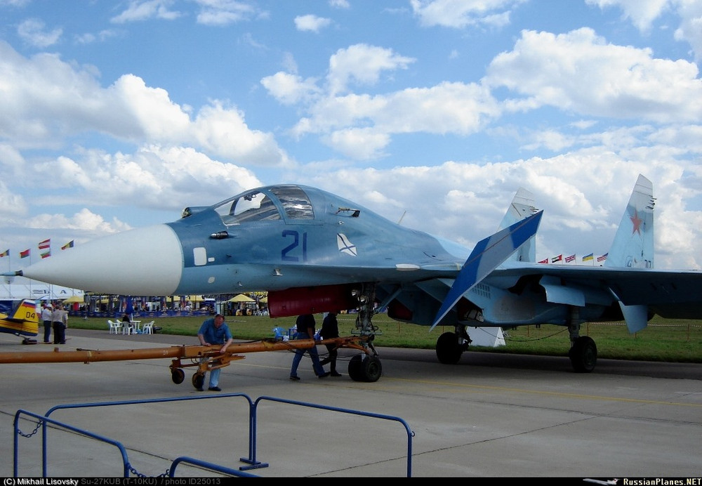 ANTD.VN - "Su-34 trên tàu sân bay" là biệt danh dành cho tiêm kích hạm Su-33UB bởi kết cấu buồng lái hai chỗ ngồi song song của nó.