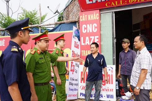 Ngay từ sáng sớm khi cơn bão số 3 vừa tan, tổ công tác trật tự do Trung tá Vũ Minh Chí cùng các đồng chí dân phòng đã xuất hiện trên những con phố để nắm tình hình, cũng như thực hiện nhiệm vụ thường xuyên là nhắc nhở những hộ kinh doanh mặt phố để hàng hóa ngăn nắp.