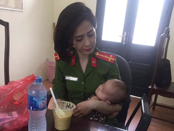 Cháu bé được nữ cán bộ CAQ Tây Hồ chăm sóc trong khi đợi người thân đến đón