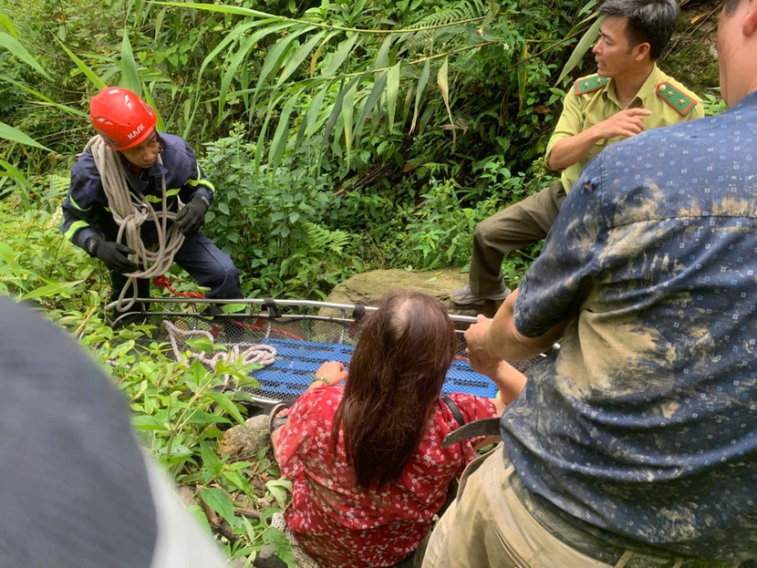 Đến 10 giờ 43 phút, nạn nhân thứ nhất là bà Đ.T.T.H, sinh năm 1971, ở phường Vĩnh Hưng, Hà Nội đã được cứu nạn an toàn trong tỉnh táo nhưng không thể tự di chuyển, nghi do chấn thương phần chân, lực lượng Cảnh sát PCCC và CNCH đã sơ cứu tại chỗ và đưa lên xe chuyên dụng của Vườn quốc gia để chuyển đến cấp cứu tại Bệnh viện Quân y 105.