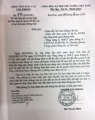 Cũng theo ông Nguyễn Thế Tuyên, trước những dấu hiệu không minh bạch, gây khó dễ cho các đơn vị đến mua hồ sơ mời thầu của Ban QLDA công trình giao thông Kon Tum, Tổng công ty xây dựng công trình giao thông 8 - CTCP đã có văn bản số 383/KHKT-TCT8 gửi UBND tỉnh Kon Tum.