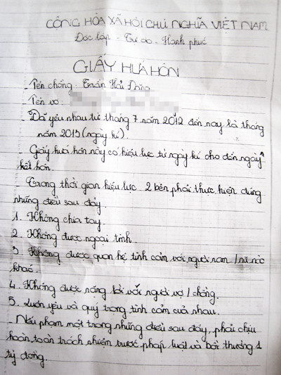 Đáng nói là, P tường trình cũng giống như Đăng khai báo, trong mối quan hệ tình cảm lẫn những lần vui vẻ trong khách sạn, P đều là người chủ động, thậm chí là chủ động trong việc trả tiền phòng khách sạn, cho tiền Đăng đón xe về quê. Đặc biệt giữa tháng 5-2013, P và Đăng có viết một bản giấy hứa hôn mà ai đọc qua cũng cười ra nước mắt. Giấy hứa hôn viết bằng giấy vở học trò và nét chữ học sinh có nói rõ “giấy hứa hôn này có hiệu lực từ ngày ký đến ngày kết hôn”. Sau đó là một số cam kết giữa 2 bên như: không chia tay; không được ngoại tình; không được quan hệ với người nam/nữ nào khác; không được nặng lời với người vợ/chồng; luôn yêu và quý trọng tình cảm của nhau... Thậm chí giấy hứa hôn còn ràng buộc là “nếu phạm một trong những điều sau đây, phải chịu hoàn toàn trách nhiệm trước pháp luật và bồi thường 1 tỷ đồng”.