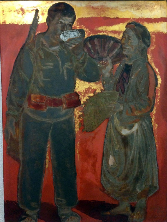 Tác phẩm sơn mài "Tình quân dân" (Bát nước" của Nguyễn Sỹ Ngọc