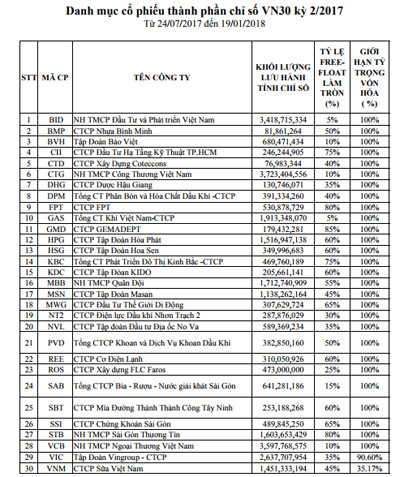 Theo công bố, danh mục mới của VN30 sẽ có hiệu lực từ 24/07 đến 19/01/2018. Trong đó, HOSE thêm cổ phiếu NVL, ROS, SAB và loại ra HAG, HNG, ITA.