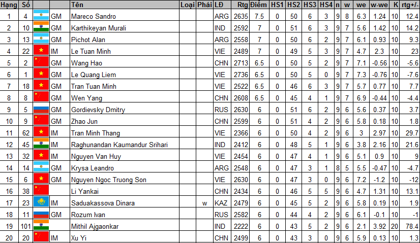 Lê Tuấn Minh của chủ nhà Việt Nam là kỳ thủ đã ngắt mạch thắng của Mareco Sandro ở ván 8, nhưng ở ván 9, kỳ thủ Argentina đã giành chiến thắng trước đồng đội Krysa Leandro sau 41 nước đi. Trong khi đó, Lê Tuấn Minh hòa Karthikeyan Murali sau 49 nước đấu trí căng thẳng nên kỳ thủ Argentina đăng quang còn Tuấn Minh chấp nhận xếp ở nhóm hạng nhì cùng Karthikeyan Murali (Ấn Độ), Pichot Alan (Argentina) với 7 điểm sau 9 ván đấu.