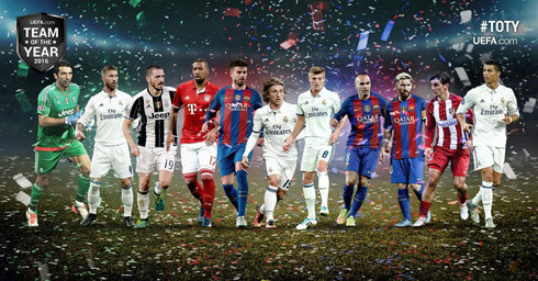 Đội hình tiêu biểu năm 2016: Gianlugi Buffon (Juventus), Jerome Boateng (Bayern Munich), Geard Pique (Barcelona), Sergio Ramos (Real Madrid), Leonardo Bonucci (Juventus), Luka Modric (Real Madrid), Toni Kroos (Real Madrid), Andres Iniesta (Barcelona), Lionel Messi (Barcelona), Antoine Griezmann (Atletico Madrid), Cristiano Ronaldo (Real Madrid).