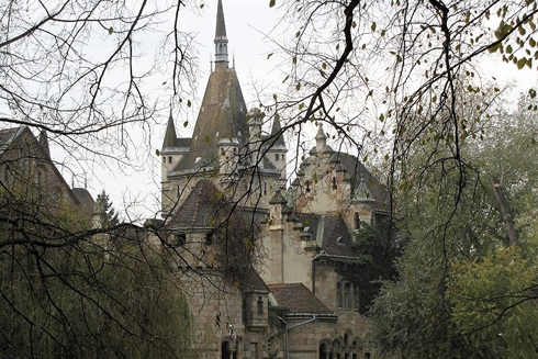 Quảng trường Anh hùng lúc này đã giảm đi vẻ hùng tráng vì những bức tượng đồng đang ảm đạm chần mình dưới mưa lâm thâm. Lát sau mưa có ngớt nhưng trời vẫn ủ ê. Chúng tôi đi bộ qua cây cầu bắc trên hồ để sang bên lâu đài Vajdahunyad. Lâu đài được xây dựng cuối thế kỷ 19, là một sự pha trộn ngoạn mục giữa kiến trúc Phục hưng, Ba rốc, Gô tích và Roman. Nó nằm bên hồ, giữa những vườn cây âm u, sẫm tối, và đầy hoa ở sân trước.