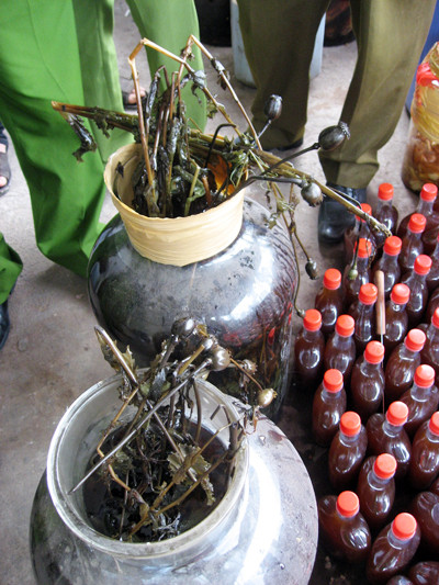 Trao đổi với PV ANTĐ, Thượng tá Vũ Quốc Tuấn - Phó trưởng Phòng Giám định Hóa pháp lý, Viện Khoa học hình sự, Bộ Công an cho biết: một số đối tượng buôn bán ma túy đang tìm cách ngâm các loại “chất cấm” này vào rượu, rồi vận chuyển ra nước ngoài tiêu thụ đề phòng khi bị bắt có thể bị xử lý hình sự. “Rượu ngâm hoa, quả, thân, rễ, lá cây thuốc phiện uống vào có thể gây nghiện, song khung hình phạt cho hành vi kinh doanh, mua bán loại rượu này lâu nay thiếu sức răn đe. Xử lý mạnh tay sẽ giúp ngăn chặn loại rượu này, hạn chế tình trạng trồng cây thuốc phiện” - Thượng tá Vũ Quốc Tuấn cho biết.