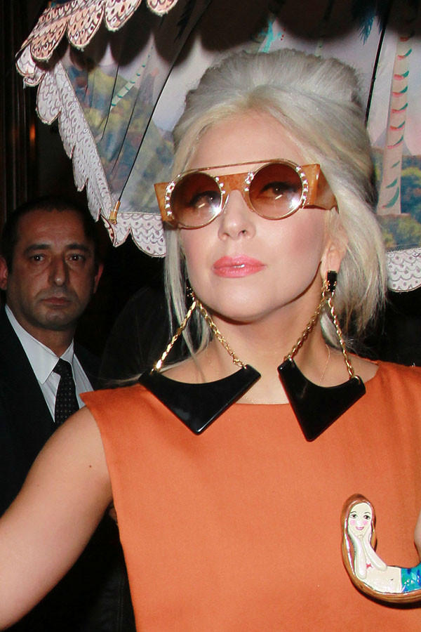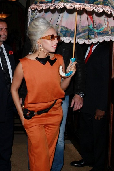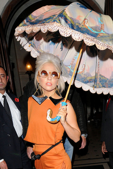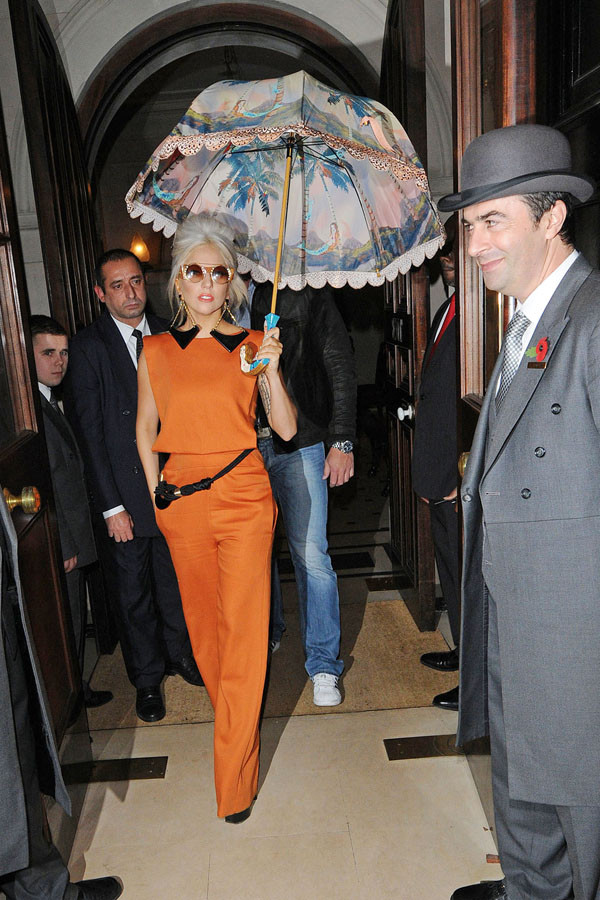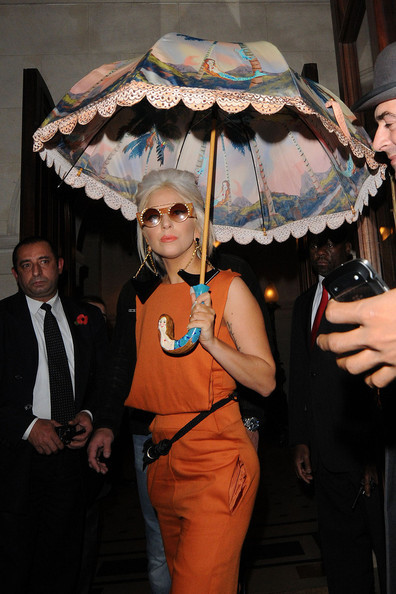 Nàng ca sỹ lừng danh rời khách sạn Lanesborough tại London, nước Anh trong bộ đồ màu cam nhẹ nhàng, nữ tính, tạo điểm nhấn với đôi hoa tai cỡ lớn, cầm theo chiếc ô in hình nàng tiên cá. Có vẻ cô nàng chưa bao giờ cạn ý tưởng cho một phong cách thời trang khác người để trở thành trung tâm của mọi sự chú ý.