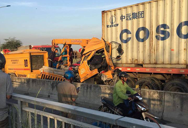 Xe cứu hộ dính chặt vào đuôi xe container