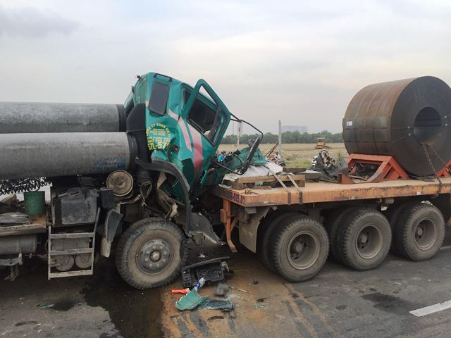 Cú đâm mạnh khiến xe này trờ tới húc mạnh vào đuôi một xe container khác đang chạy phía trước. Vụ va chạm liên hoàn làm cọc nhồi trên xe container biển số 57L đẩy về phía trước găm chặt vào cabin xe này làm tài xế bị mắc kẹt bên trong.