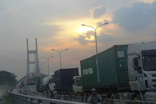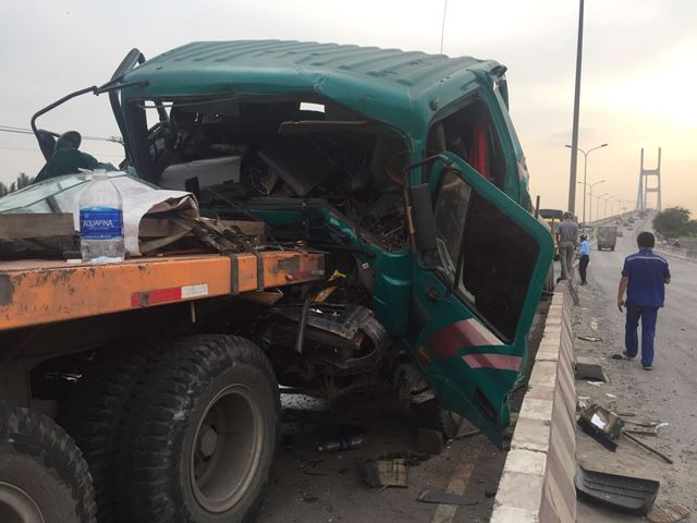 16h chiều 3-11, xe container mang BKS: 57L - 5795 kéo theo rơ-móc chở cọc nhồi, lưu trên cầu Phú Mỹ, hướng từ quận 7 sang quận 2. Khi xe này vừa đổ hết dốc cầu thuộc phường Thạnh Mỹ Lợi, quận 2, thì bất ngờ tông mạnh vào đuôi xe container mang BKS: 50LD - 057.79 kéo theo rơ-móc chở sắt cuộn, chạy cùng chiều.