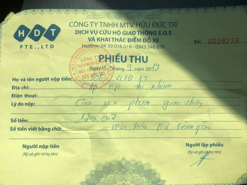 Sau khi thu của anh Toàn 1,2 triệu đồng tiền cẩu xe, chủ bãi xe có xuất phiếu thu của Công ty TNHH MVT Hữu Đức Trí.