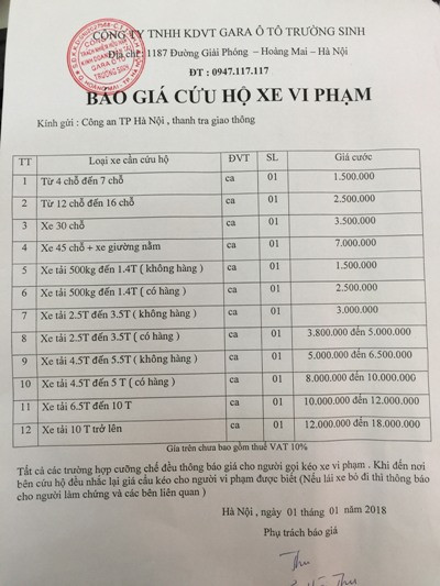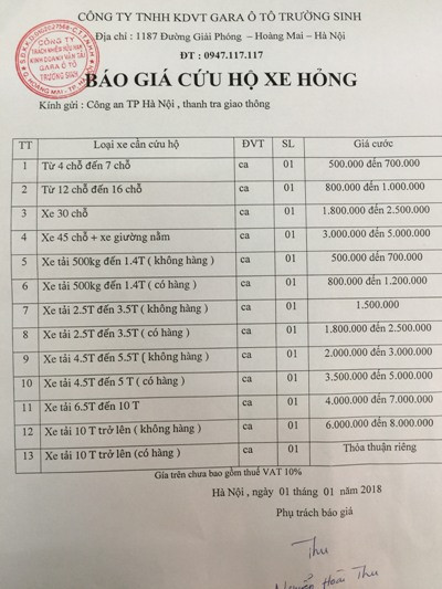 Báo giá cứu hộ xe hỏng của Công ty TNHH KDVT gara ô tô Trường Sinh