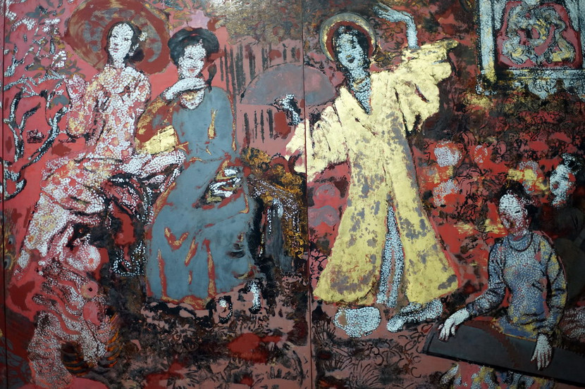 Những mảng trứng,vàng, son bị bóc tróc sau quá trình vệ sinh bề mặt của "Vườn xuân Trung Nam Bắc"