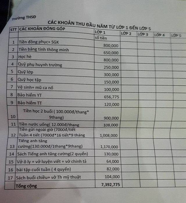 Hàng loạt khoản mà giáo viên đưa ra và các phụ huynh thấy không thể chấp nhận được gồm: tiền lớp chất lượng cao 600.000 đồng, bảng tính thông minh 650.000 đồng, học hè 800.000 đồng, tiếng Anh tăng cường 1.170.000 đồng...