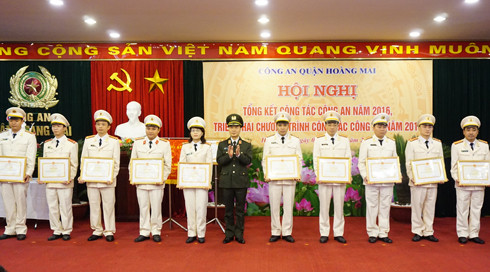 Với những thành tích, kết quả xuất sắc trong thực hiện các phong trào thi đua và trong công tác đấu tranh phòng, chống tội phạm, năm 2016, CAQ Hoàng Mai được Bộ Công an tặng Cờ “Đơn vị xuất sắc phong trào thi đua”. Trong năm 2016, toàn quận có 881 lượt cá nhân, tập thể lập thành tích xuất sắc được các cấp khen thưởng.