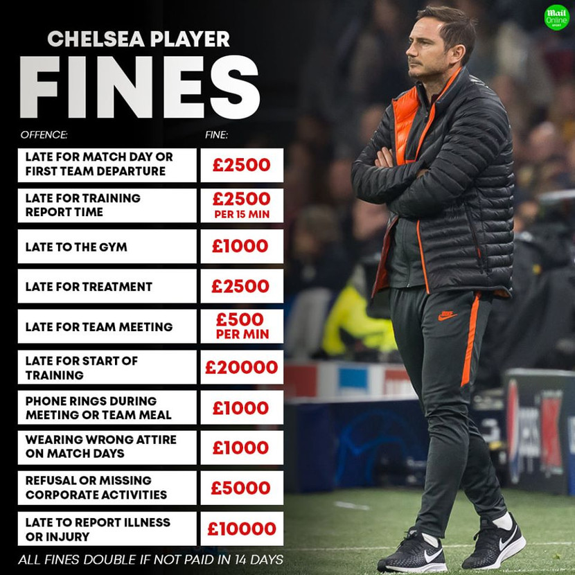 Chẳng hạn, nếu cầu thủ Chelsea đến muộn trong buổi tập, họ sẽ phải nộp phạt số tiền là 20 nghìn bảng Anh (gần 600 triệu đồng). Con số này có thể bằng 1/2 hoặc 1/3 mức lương tuần của một cầu thủ trẻ đội 1.